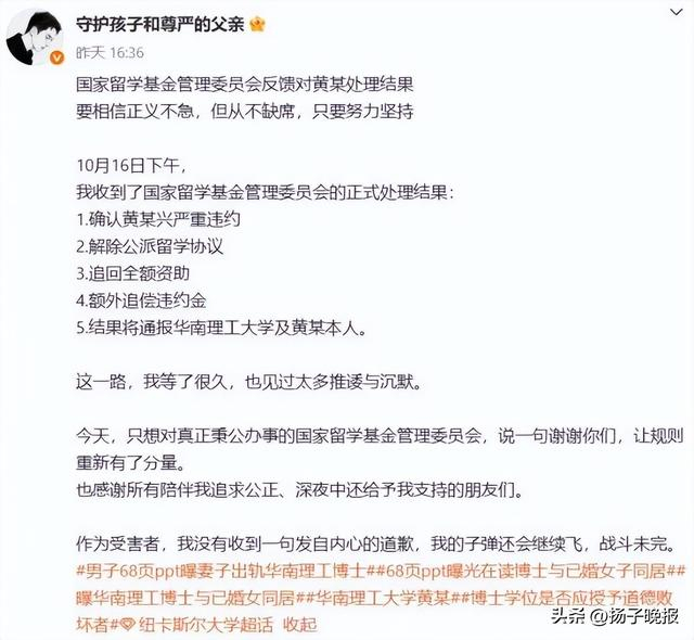10月16日下午,发布PPT的当事人张先生表示,国家留学基金管理委员会已向他反馈对黄某的处理结果。